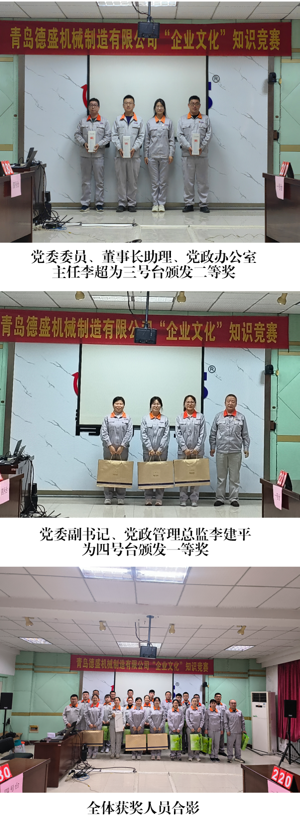 為進(jìn)一步學(xué)習(xí)宣傳公司企業(yè)文化的豐富內(nèi)涵,不斷增強(qiáng)員工弘揚(yáng) 和踐行企業(yè)文化的自覺性,提升企業(yè)“軟實(shí)力”,2023 年 3 月 16 日下午,青島德盛機(jī)械制造有限公司組織開展了企業(yè)文化知識(shí)競(jìng)賽活動(dòng), 公司董事長(zhǎng)孫佩璋,黨委副書記、黨政管理總監(jiān)李建平,黨委委員、董事長(zhǎng)助理、黨政辦公室主任李超,總經(jīng)理助理、人力資源部經(jīng)理劉 建芹出席本次活動(dòng)。